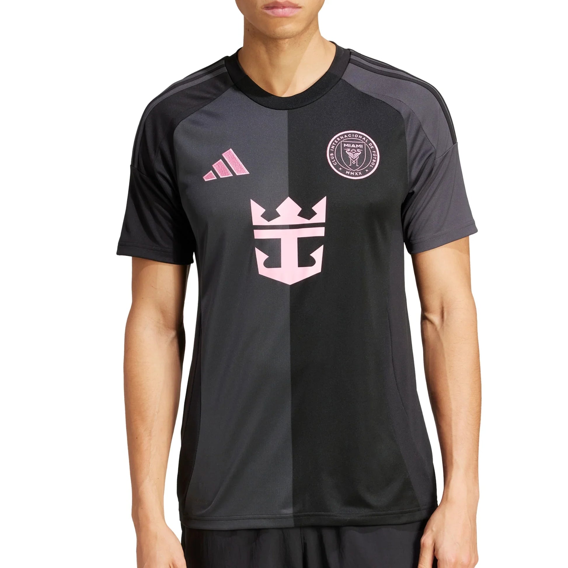 Bring Miami style to the stadium in this elegant Inter Miami CF away jersey from adidas. With pink details popping against a black and carbon half-and-half design, this supporter shirt exudes sophistication. Its moisture-managing AEROREADY and soft fabric are there to keep fans comfortable. A club sign-off and sewn-on crest show you appreciate first-class football.