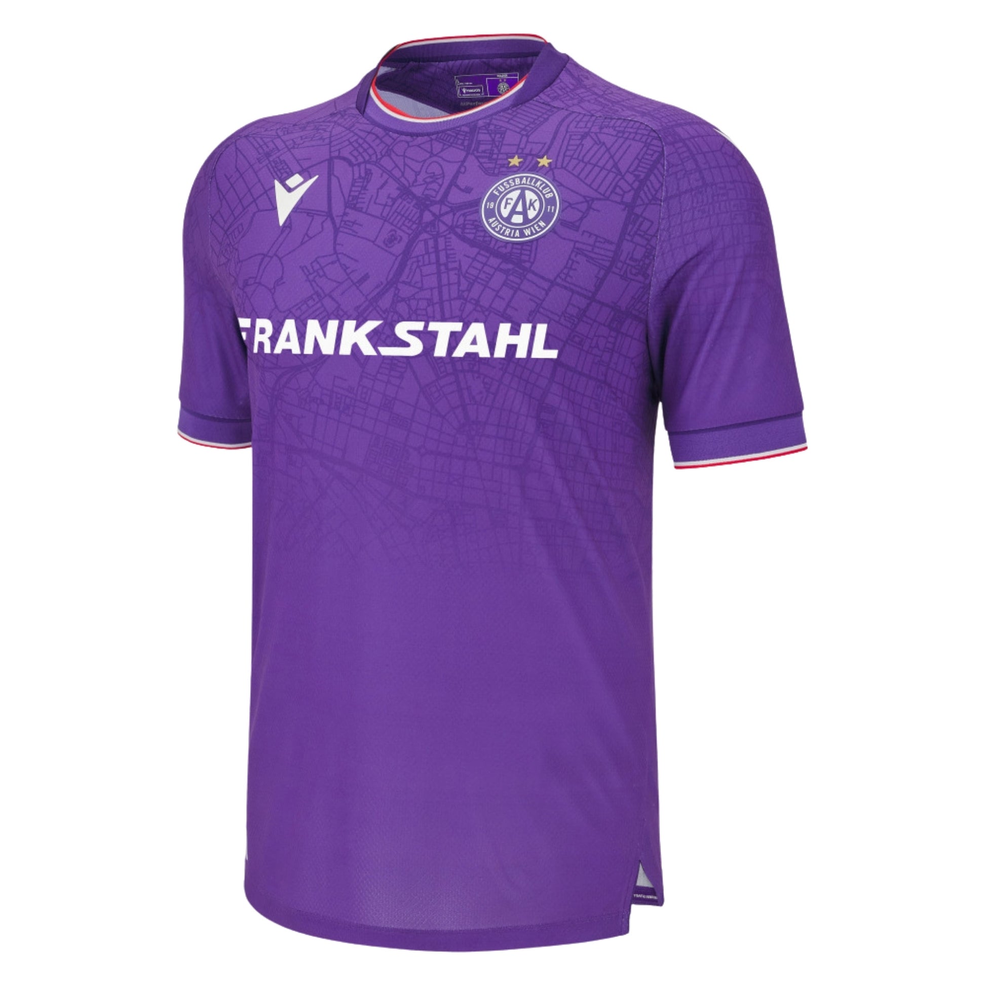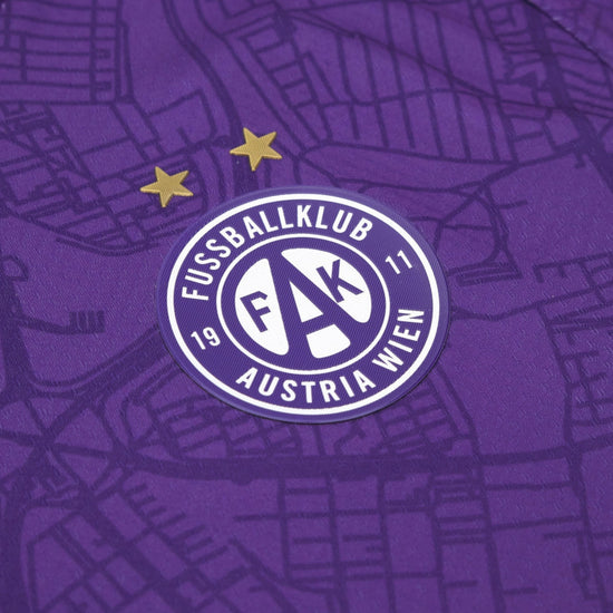 The FK Austria Wien 2025/26 home shirt is a visual tribute to the deep bond between the team and the city. The purple base is crossed by a sublimated topographic map of Vienna that extends across the entire surface of the shirt, turning every detail into a declaration of love for the territory. The round collar and sleeve edges are finished with fine red and white accents, evoking the national colours. The construction in Eco Exalock and Eco Micromesh ensures comfort and performance. On the back of the collar, the 'Austria Wien' inscription completes a design that blends cultural roots with competitive spirit.