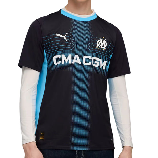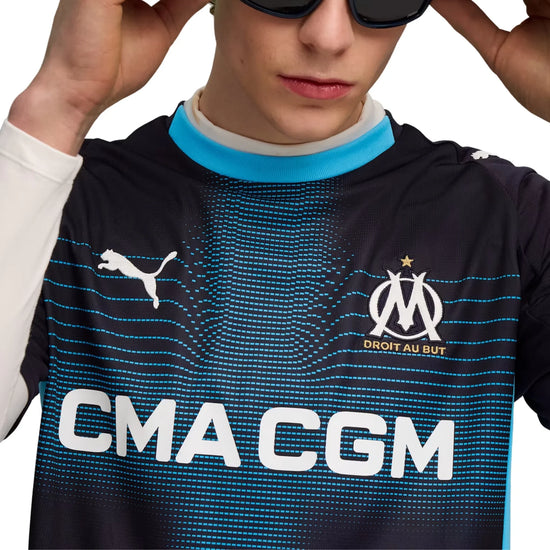 Show your support for Olympique de Marseille with the official 25/26 Away jersey. This jersey features a bold and modern design with a predominantly dark color and a digital pattern in shades of blue across the front. The PUMA Cat logo and club crest are prominently displayed on the chest. Crafted with PUMA's dryCELL technology, this jersey ensures maximum comfort and performance, keeping you cool and dry whether you're cheering from the stands or playing on the field.