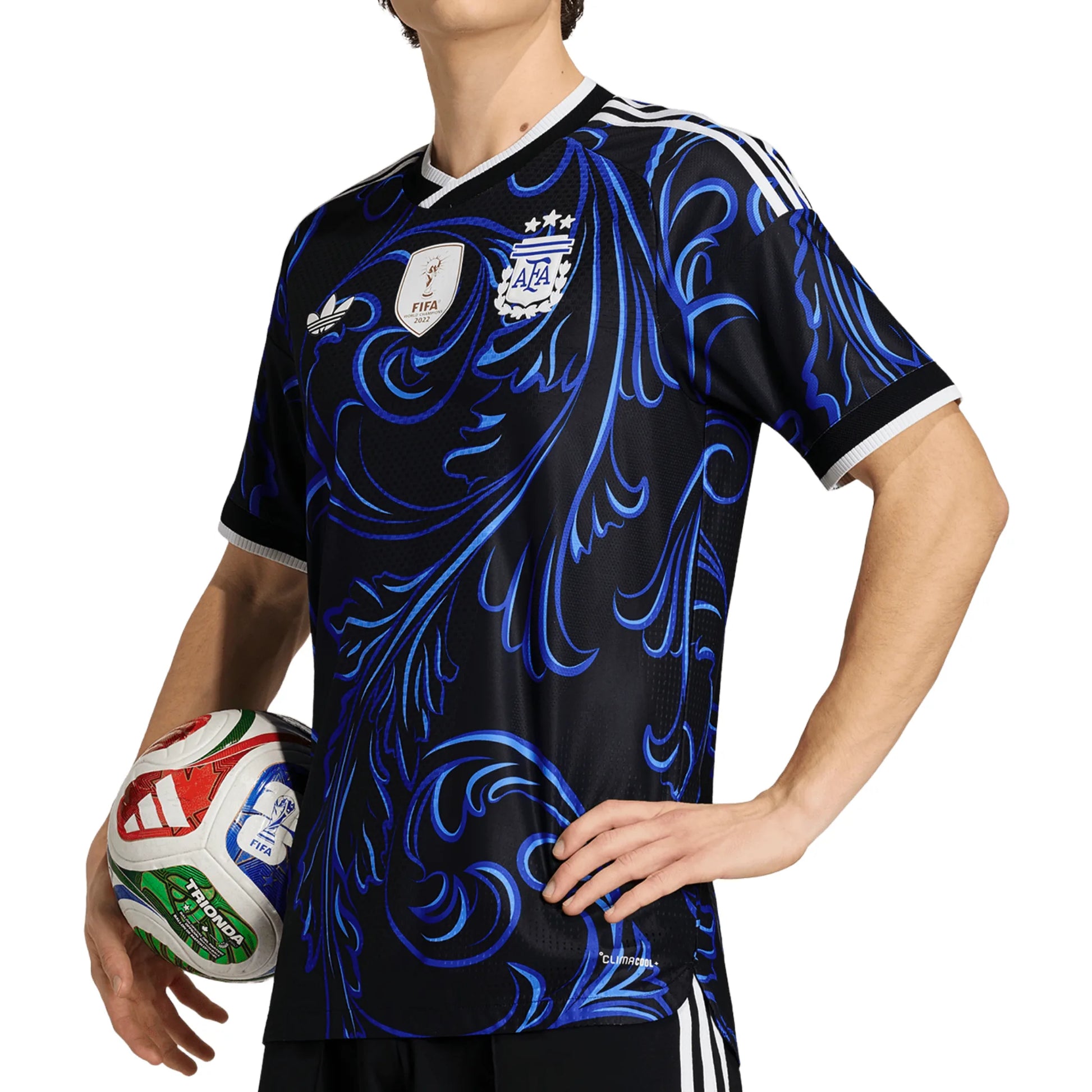 A tribute to the spirit of Argentina, the Argentina 26 Away Authentic Jersey captures the passion and artistry of Argentine culture. With its bold swirling design, the jersey is inspired by popular artistic expressions. Designed for those who live and breathe football, it combines style with performance. Climacool+ technology helps to keep you stay fresh, cool and comfortable throughout your game. Crafted with a higher crew neck, this adidas jersey offers a tailored fit that feels locked-in, thanks to body mapping technology. A heat-applied label and UV-print serve as a seal of authenticity. With its official match design, this is the jersey worn by players on the pitch, embodying the spirit of the game. Channel Argentinian pride whenever you wear it.