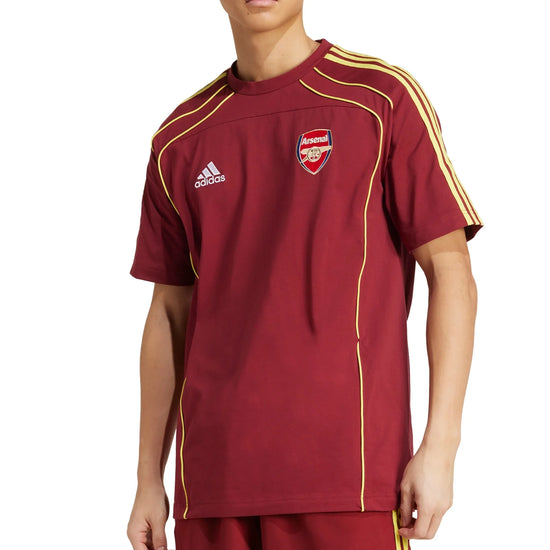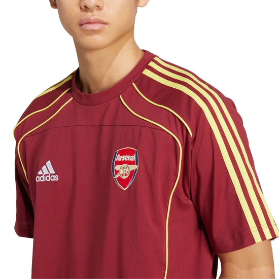 This adidas Arsenal tee takes design cues from 2010s football fashion. Contrast piping details and a club badge stand out on the chest. Soft single jersey fabric keeps you comfortable while you represent North London's finest.