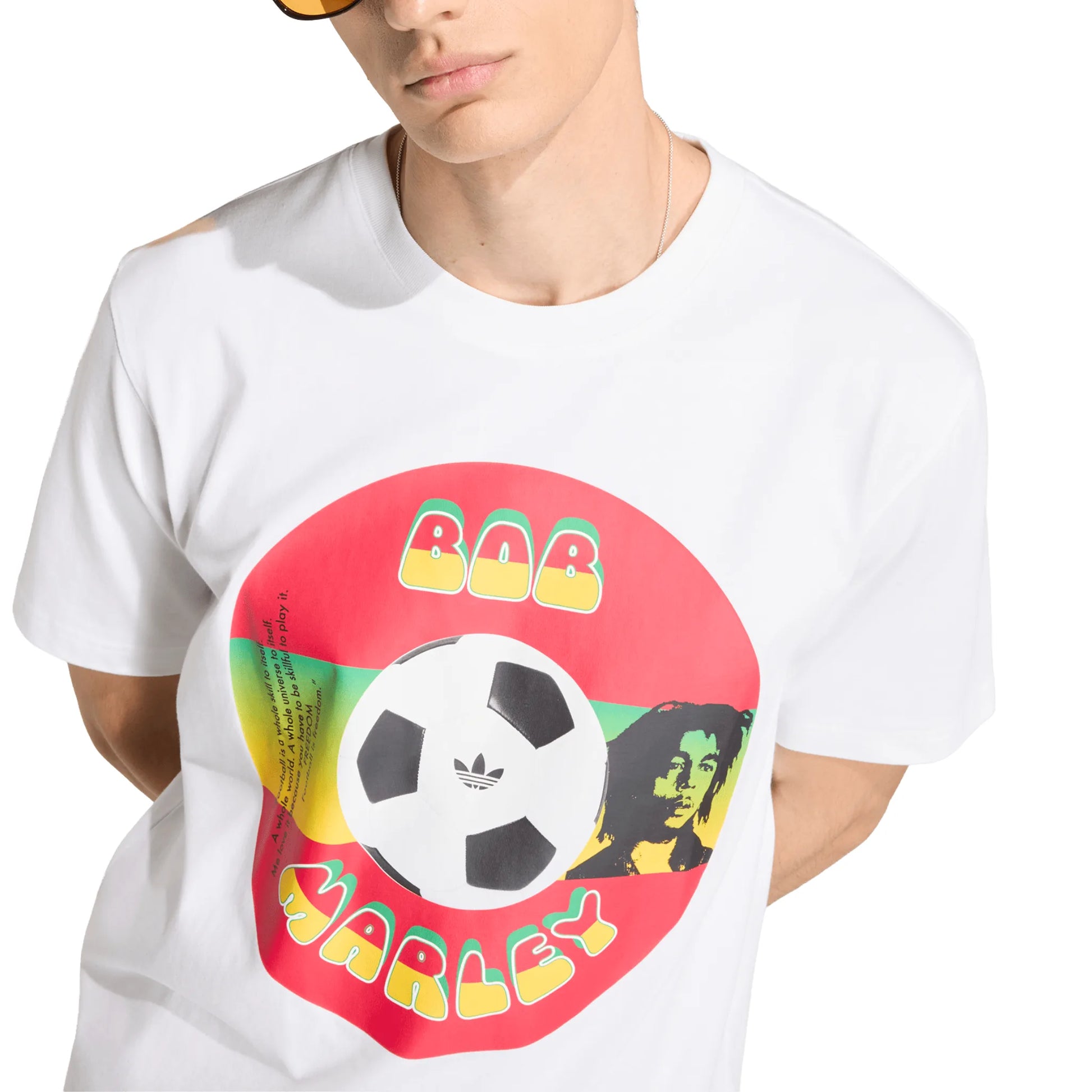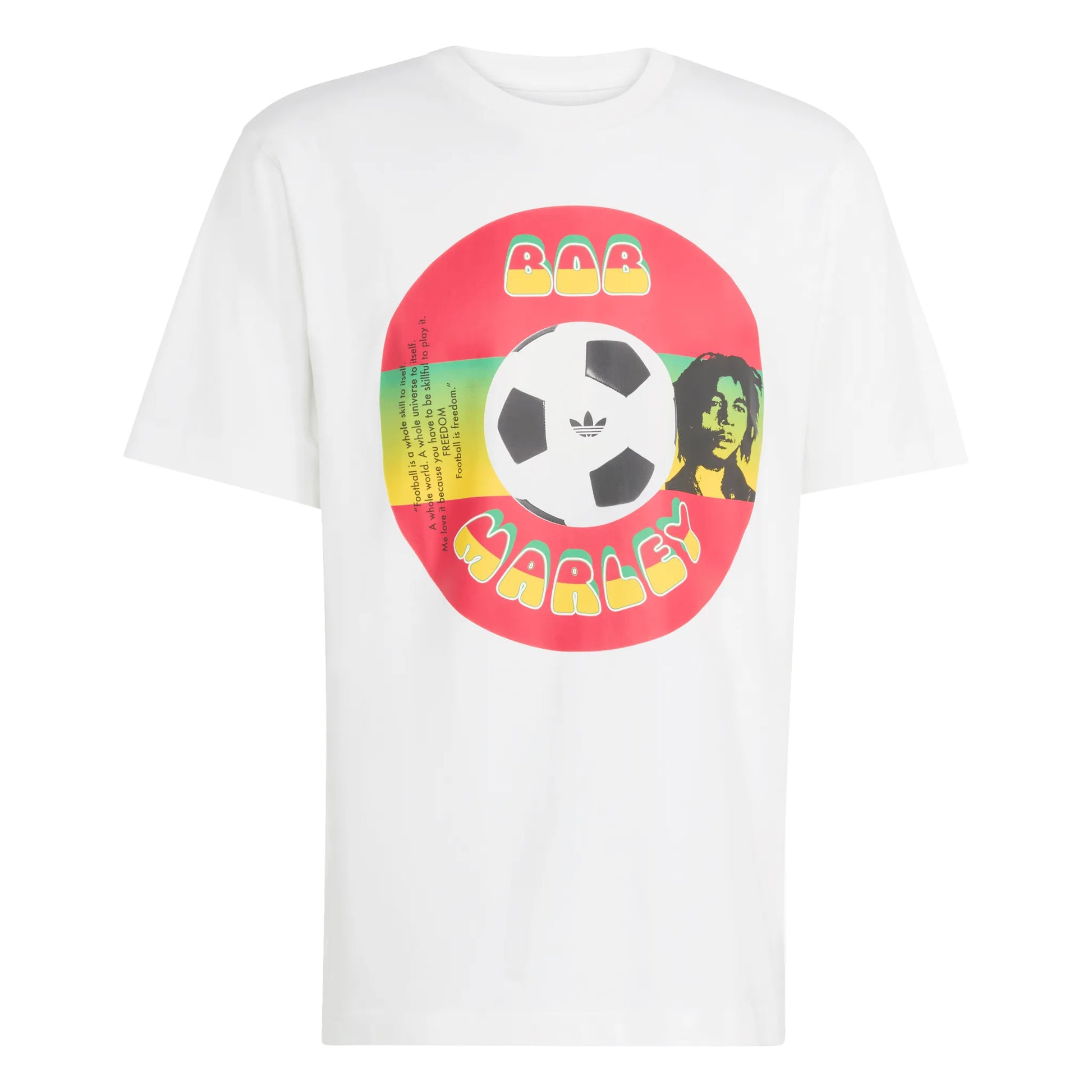 Step into the rhythm of football culture with the Bob Marley Originals T-Shirt from adidas. The t-shirt celebrates the vibrant intersection of music and football, drawing inspiration from Bob Marley’s legacy and its cultural impact on the beautiful game. This product speaks to all vintage and retro lovers. Crafted from soft single jersey, it offers a comfortable regular fit that’s suitable for everyday wear, whether you’re heading to a match or relaxing with friends. The classic crew neck delivers a timeless look, while the bold graphic highlights the collaboration. Finished with a Trefoil logo, this adidas t-shirt stands out as a statement piece in your collection