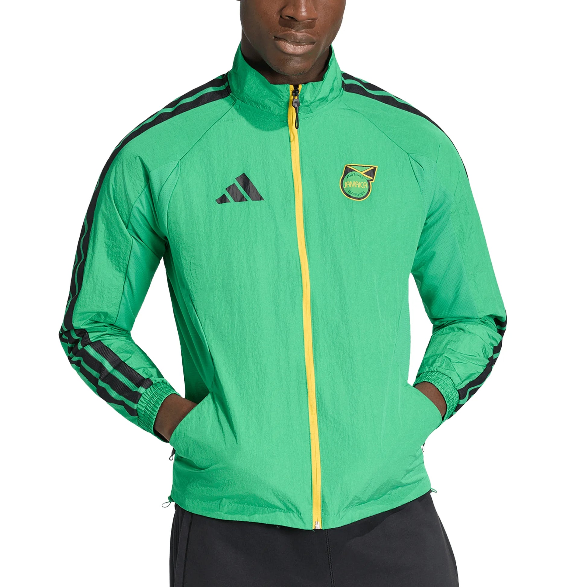 The spirit of football culture is embedded in the Jamaica x Bob Marley Home Anthem Jacket. This jacket is designed to complement your Jamaica match-wear kit, drawing inspiration from the functional design of the match-wear jersey. With its shiny fabric, this jacket is designed to stand out and provide a stylish edge to your casual wardrobe. Crafted from a plain weave material, the jacket offers durability and comfort, making it versatile wear for both on and off the pitch. The stand-up collar adds a touch of sophistication, while the full zip closure offers convenience and ease of wear. Whether you're cheering from the stands or heading to the gym, this jacket helps you rep your team in style. adidas branding is subtly incorporated, reflecting a commitment to quality and performance. Embrace the fusion of lifestyle and sport with this iconic piece that celebrates football heritage and modern design.