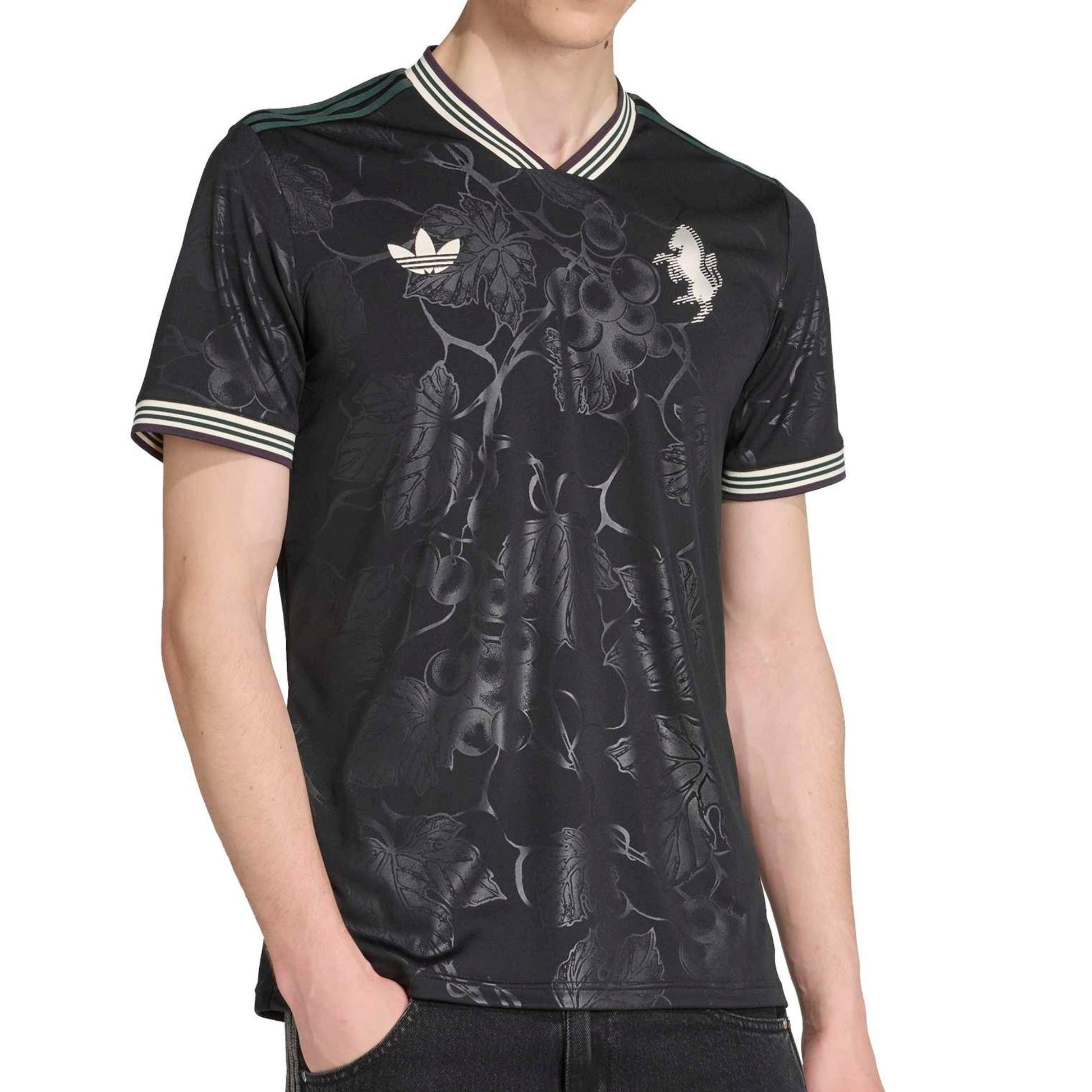 Raise a glass to your football heroes in a Juventus jersey that pays tribute to Piedmont's wine-making tradition. Standing out from black colours, an embroidered adidas Trefoil and classic club badge join subtle, vineyard-inspired graphics to produce an understated, elegant look. Created to keep fans comfortable and relaxed, this shirt features soft fabric and moisture-managing AEROREADY.