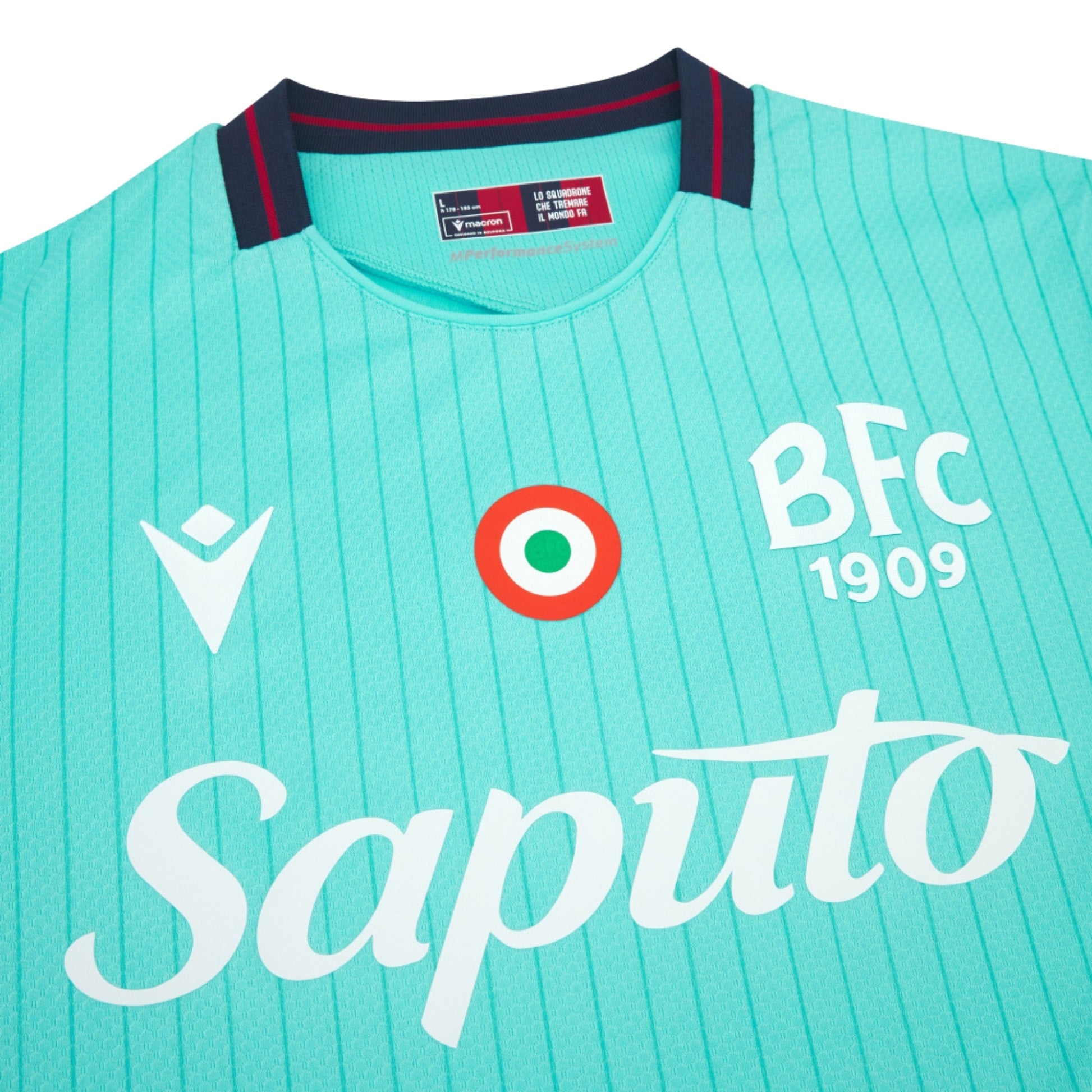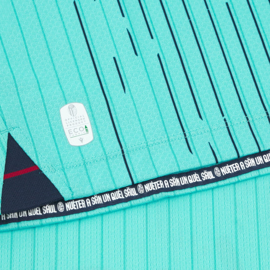 The Bologna FC 1909 third kit for the 2025/26 season stands out with a modern and essential design, inspired by the optical movement of waves and the symbol of Neptune. The bright turquoise color is enhanced by a subtle tone-on-tone pinstripe pattern, with contrasting details on the collar and sleeve cuffs. The slim fit and Eco Micromesh fabric ensure maximum comfort and breathability. Inside the collar, a personalized tape features the phrase 'A SÅN UN QUÈL SÅUL', while the back proudly displays the 'WEAREONE' claim. A sustainable kit rich in identity, designed for those who live and breathe their passion for the rossoblù every day.
